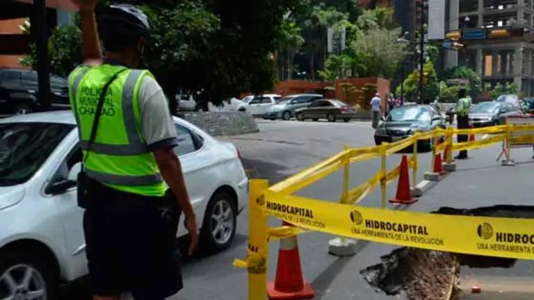 La rotura de una tubería de aguas blancas, perteneciente a Hidrocapital, produjo el hundimiento en un canal de la Avenida Francisco de Miranda, a la altura del Hotel Embassy Suites en Campo Alegre.