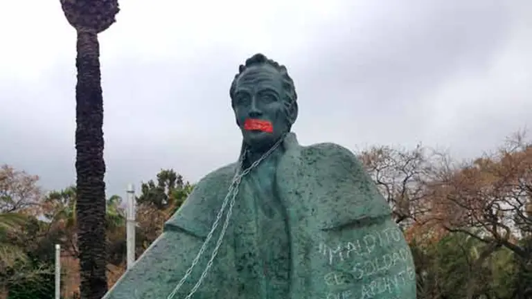 Rayaron en su totalidad la estatua del prócer amordazándolo con una cinta adhesiva roja y colocando en sus brazos cadenas y grilletes.