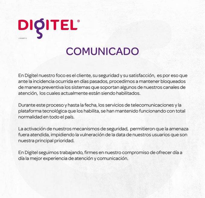 La empresa de telefonía, Digitel, informó por medio de un comunicado que sus servidores seguirán bloqueados, como método de prevención ante un reciente ciberataque contra sus plataformas.