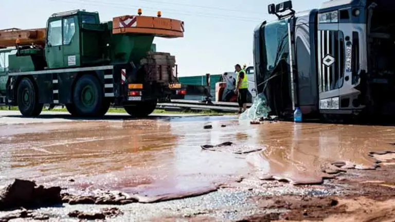 Un tractocamión volcó en una autopista de Polonia y derramó toneladas de chocolate líquido que se convirtió rápidamente en una gran masa pegajosa.