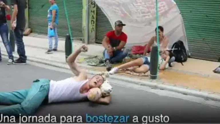 Su lecho no es el único que está sobre la vía. Hay decenas de carpas y hamacas con gente en prendas de dormir y zapatos de felpa. Está nublado y muchos bostezan sin rubor.