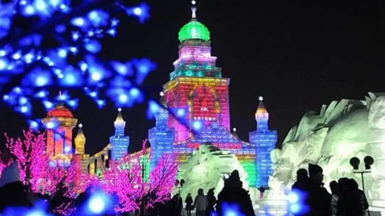 La edición número 31 del evento parece la más impresionante de todas: la exhibición central presenta castillos y edificios famosos, cuyos bloques helados son iluminados por la noche.
