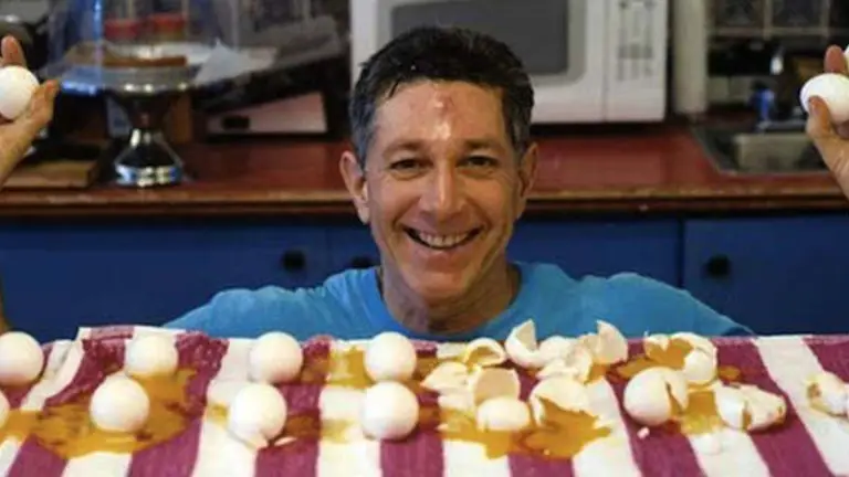 Ashrita Furman, descubrió que sería bueno romper un récord por darse de topes con la cabeza en una mesa llena de huevos, para ver cuántos rompía en un minuto.