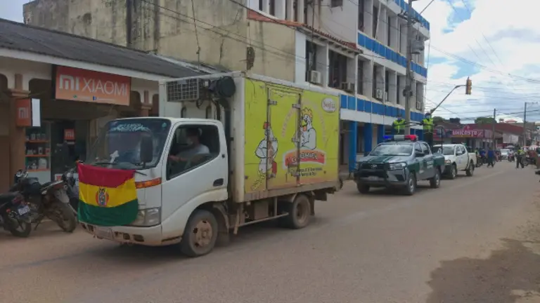 Residentes de la ciudad vieron la llegada del camión de pollos con interés ya que se le puso la bandera boliviana cuando salió del aeropuerto.