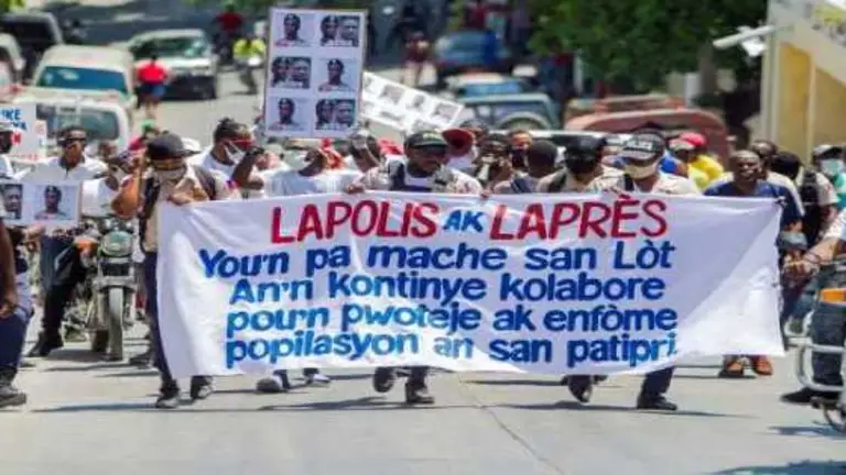 Un grupo de policías haitianos, acompañados por activistas, se manifestó el pasado domingo en las calles de Puerto Príncipe para exigir la liberación de un compañero, el derecho de formar un sindicato y mejores condiciones laborales, en medio de la situación que vive el país por el coronavirus.