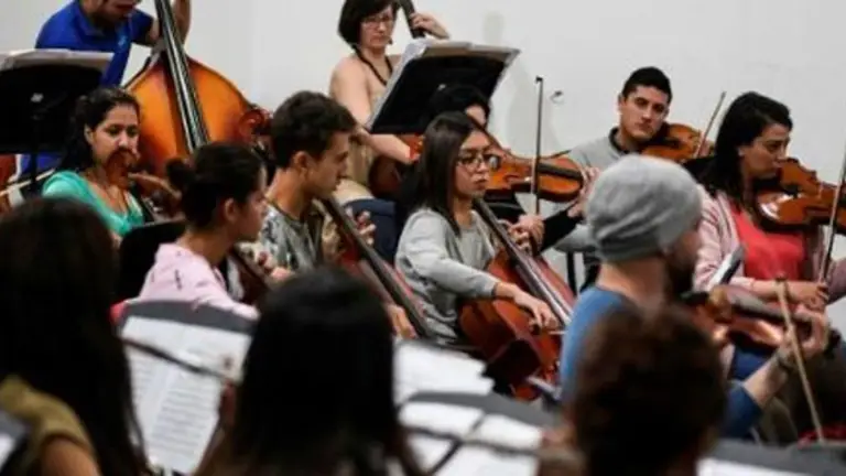 El centenar de concertistas afina con esmero los instrumentos: oboes, violines y percusiones, cuyos sonidos de a poco calientan la fría sala de ensayo en el noroeste de la capital colombiana.