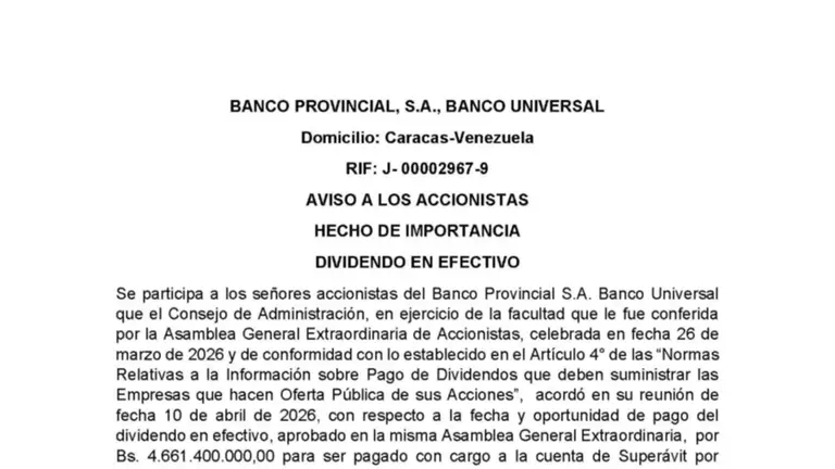 BANCO PROVINCIAL, S.A., BANCO UNIVERSAL COMUNICADO A LOS ACCIONISTAS 28 ABR 26