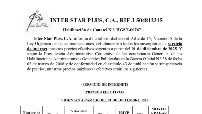 NOTIFICACIÓN INTER STAR PLUS, C.A., 01 DIC 25