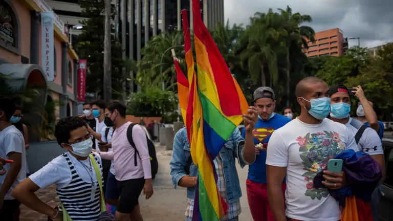 Activistas, defensores de Derechos Humanos y miembros de la comunidad LGTBI protestaron este sábado contra la discriminación vivida por dos jóvenes homosexuales la noche del viernes en una pizzería-karaoke del municipio Chacao.