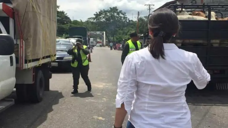 "Verguenza les debe dar. Verguenza les debería dar como militares venezolanos", enfatizó la dirigente opositora al preguntarle a los oficiales de la GNB el motivo de la tranca vehícular.
