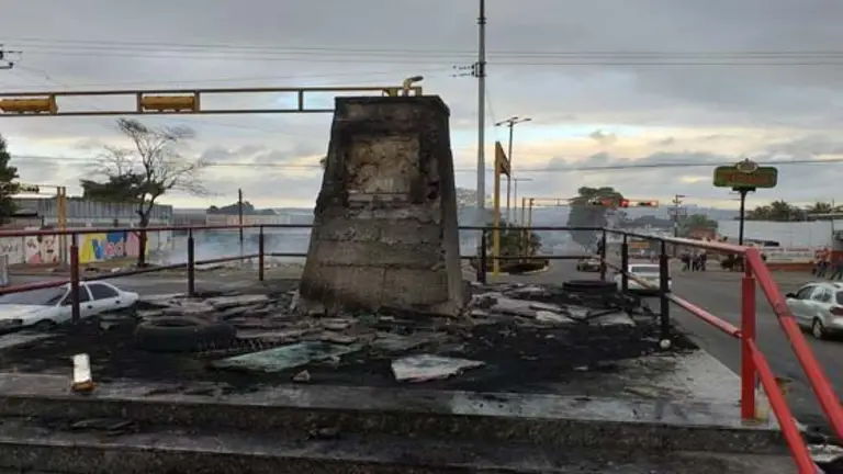Por segunda noche consecutiva, comunidades de todo el país salieron a las calles a protestar. En varios videos en Twitter se puede apreciar el momento en el que la escultura se encuentra prendida en llamas para después irse derrumbando debido al fuego.