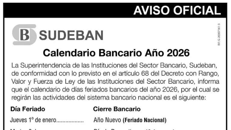 La Superintendencia de las Instituciones del Sector Bancario (Sudeban) ya informó  el cronograma oficial de asuetos para este 2026.