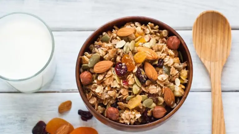 3 Una vez fuera del horno, mezclar con las pasas y cuando esté completamente frío guardar en frascos con tapa. Sirva con frutas y leche tibia.